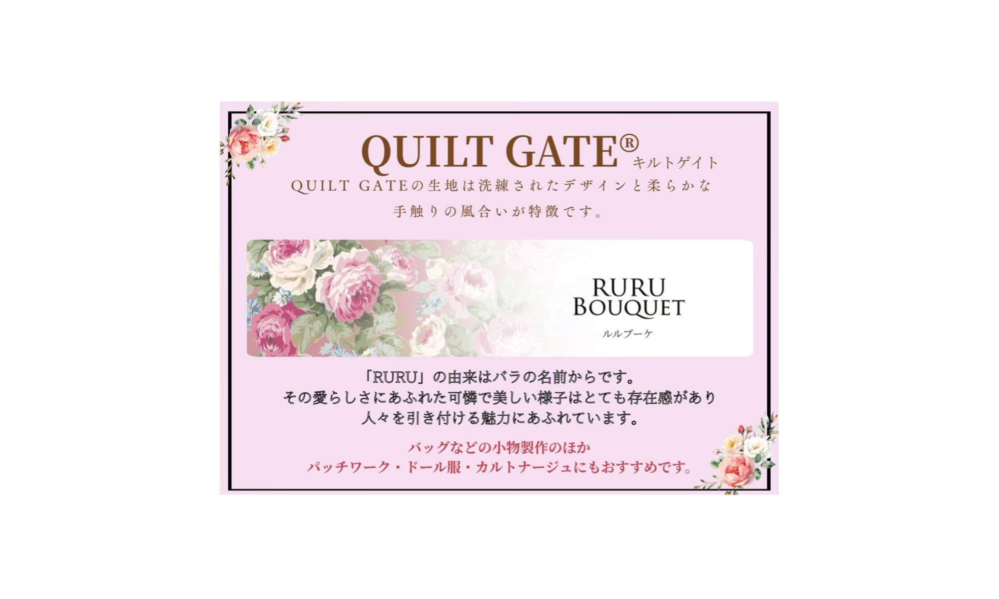 【2520-12D】 Shabby Chic キルトゲイト ルルブーケ QUILTGATE RURUBOUQUET 薔薇 花柄 バラ ばら ローズ 生地 ハンドメイド パッチワーク カルトナージュ ドール服 コットンプリント